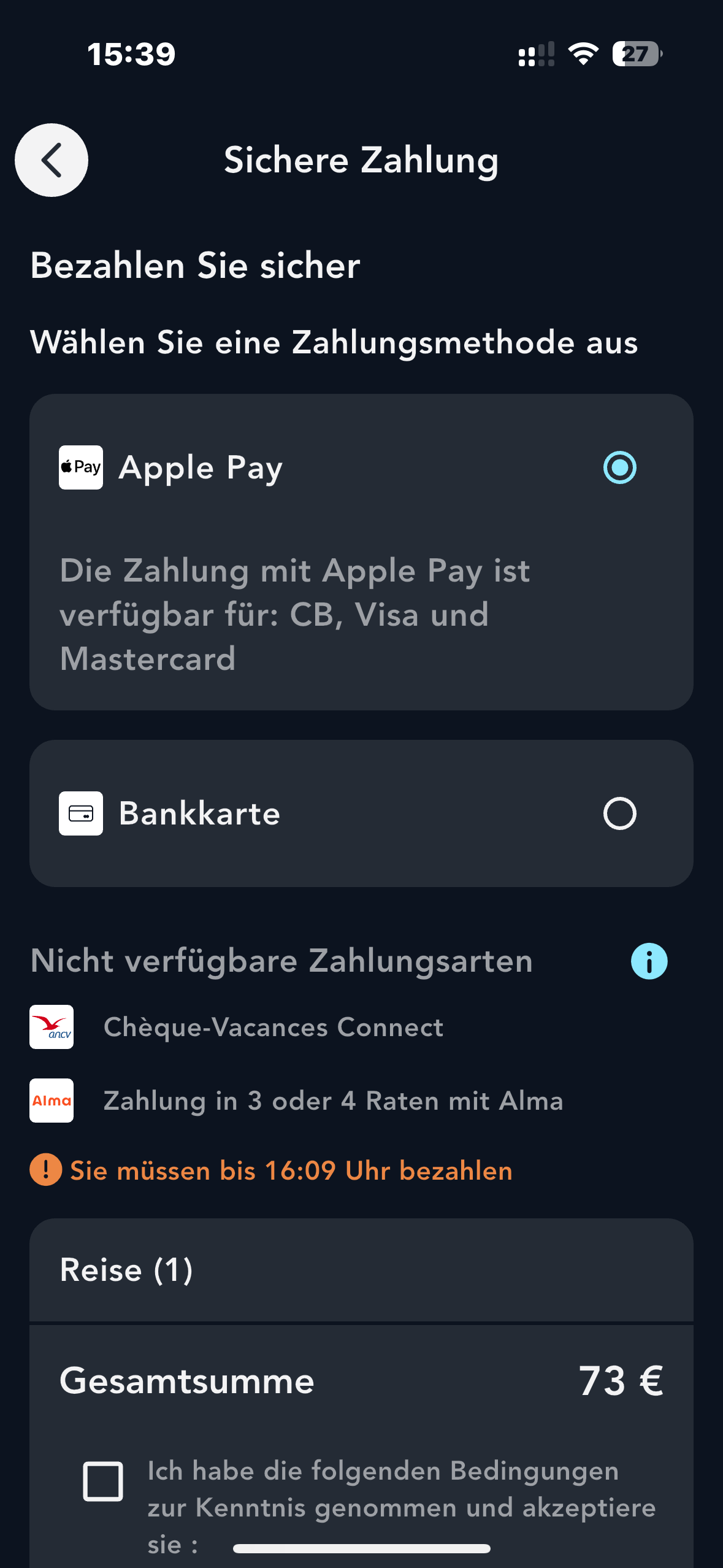 Wählen Sie Ihre Zahlungsmethode, um die Buchung abzuschließen.