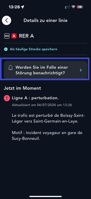 Richten Sie für Ihre Fahrten in Paris und Umgebung eine Benachrichtigung für die Strecken ein, die Sie häufig benutzen. Bei Störungen, die zu Verkehrsbehinderungen führen, werden Sie per Benachrichtigung informiert.