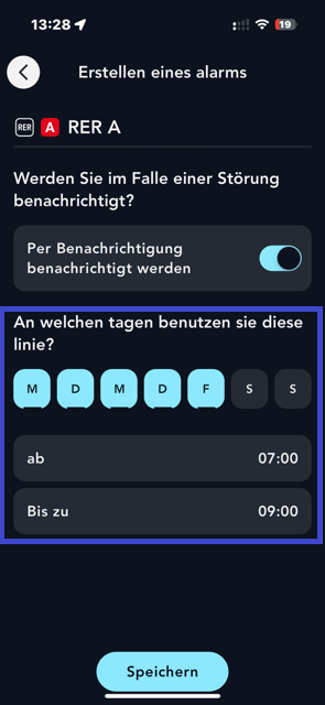 Wie kann ich die Benachrichtigungsfunktion für die Strecke aktivieren? Gehen Sie in der App in die Rubrik ""Verkehrs- und Streckeninfos"". Wählen Sie Ihre Transilien-, RER-, Metro- oder Straßenbahnlinie aus und drücken Sie dann auf ""Möchten Sie im Fall einer Störung benachrichtigt werden? Anschließend müssen Sie nur noch die gewünschten Tage und das Zeitfenster auswählen.
