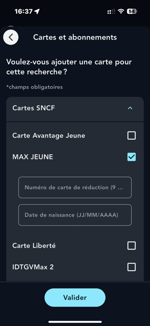 Sélectionnez la tranche d'âge (4-29 ans) dans le menu Voyageur 1, puis indiquez votre âge et enfin l'abonnement correspondant MAX JEUNE