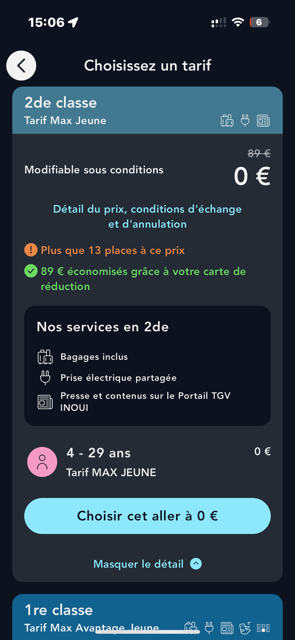 En plus des billets MAX JEUNE à 0€, vous pouvez bénéficier du tarif MAX AVANTAGE JEUNE et avoir une réduction de 30% sur TGV INOUI et Intercités à réservation obligatoire en 1re et 2de classe, sur l’ensemble des trains ouverts à la réservation.