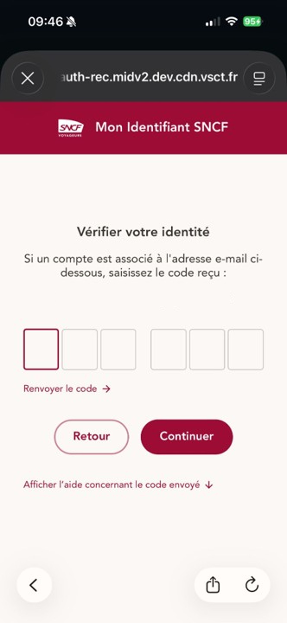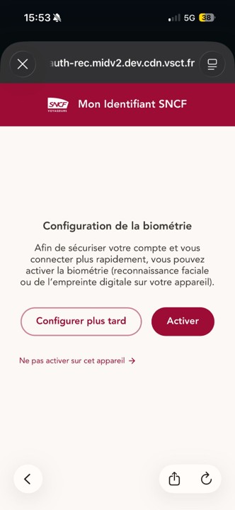 Cette évolution entraînera la déconnexion automatique à votre compte. Pour accéder de nouveau à vos informations de voyage et à vos billets, il vous suffira de vous reconnecter avec vos identifiants habituels en saisissant votre e-mail, votre mot de passe et le code de vérification envoyé sur votre adresse e-mail puis de vous laisser guider pour activer la biométrie.